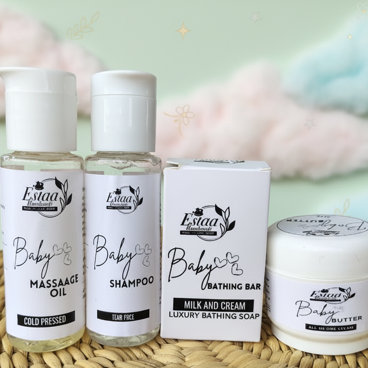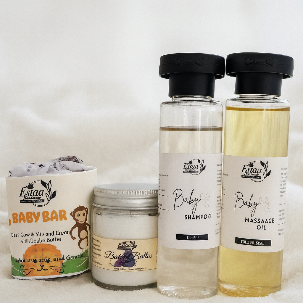 A comprehensive bathing and care collection designed for your baby's delicate skin. This curated set includes a gentle cleansing bar, nourishing shampoo, soothing massage oil, and rich moisturizing butter—each formulated to support your infant's sensitive needs during daily care routines.